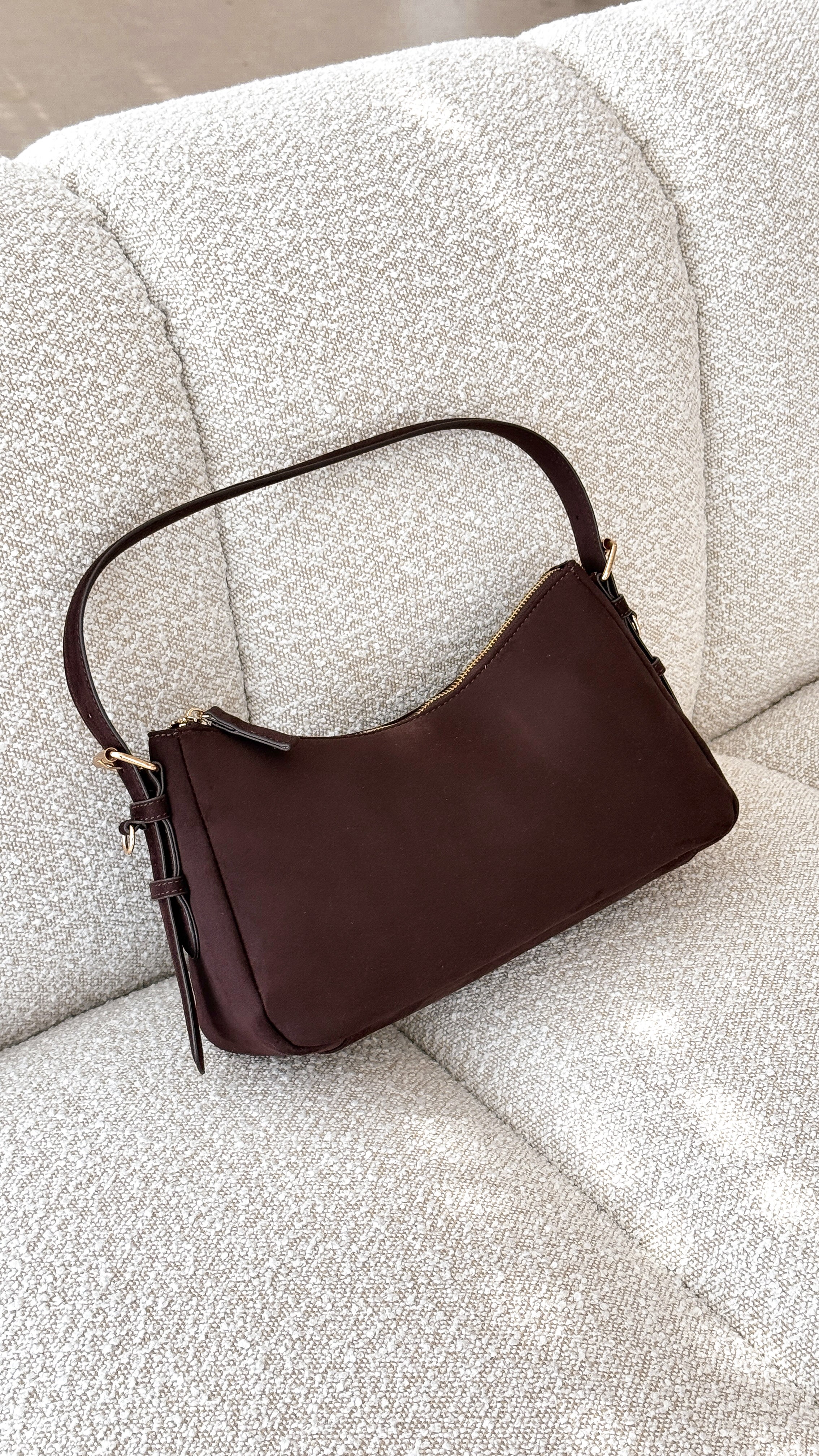 Elevate your daily style with the Allegra Shoulder Bag in Chocolate Suede by Billini. This refined accessory features a soft faux suede texture and a clean, structured design. With its elegant short shoulder strap and smooth zip closure, it seamlessly transitions from daytime chic to evening sophistication.