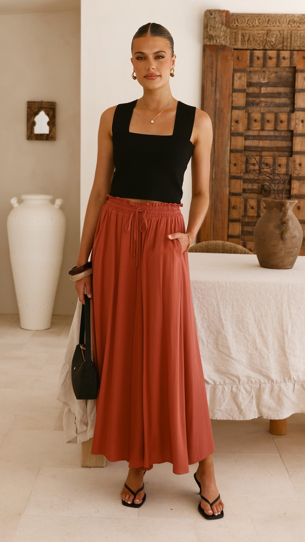 The Aria Wide Leg Pants in Terracotta offer a relaxed silhouette, featuring an elasticated waistband with a drawstring for a tailored fit. Their wide-leg cut is enhanced by practical side pockets, blending elegance with everyday convenience.