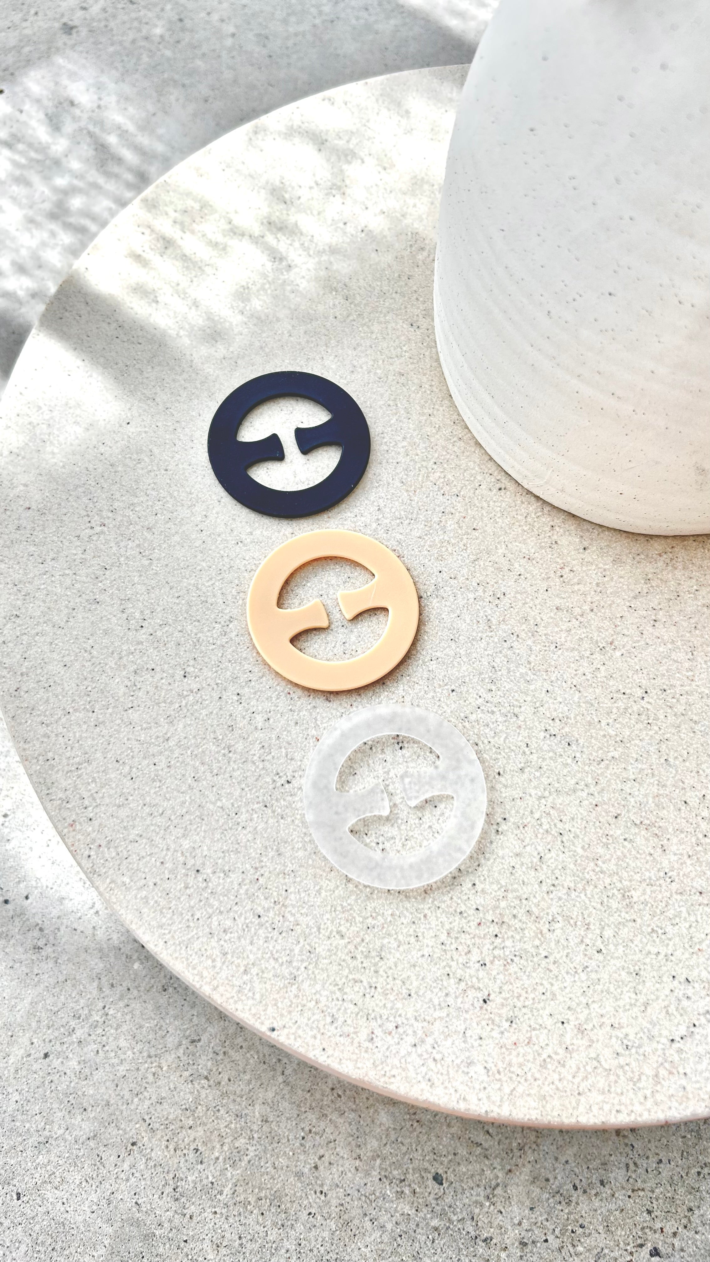 Our Bra Clips are 43mm in diameter and come in a three pack of clear, black and barely-there-nude to suit any outfit!