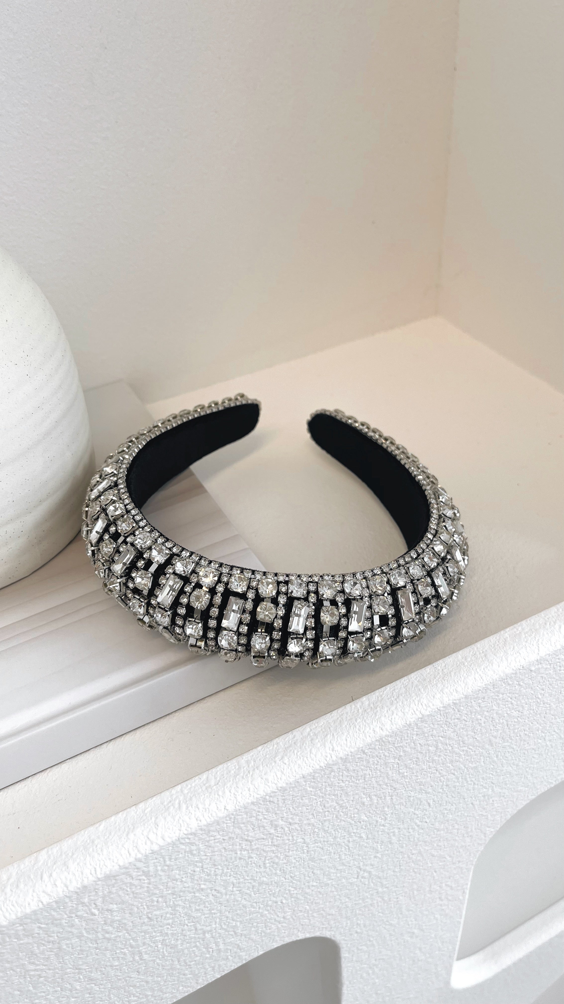 The Delacruz Headband is crafted with a black velvet base and faux diamantes. The wrap around beaded detailing creates a seamless look, and pairs perfectly with your racewear looks.