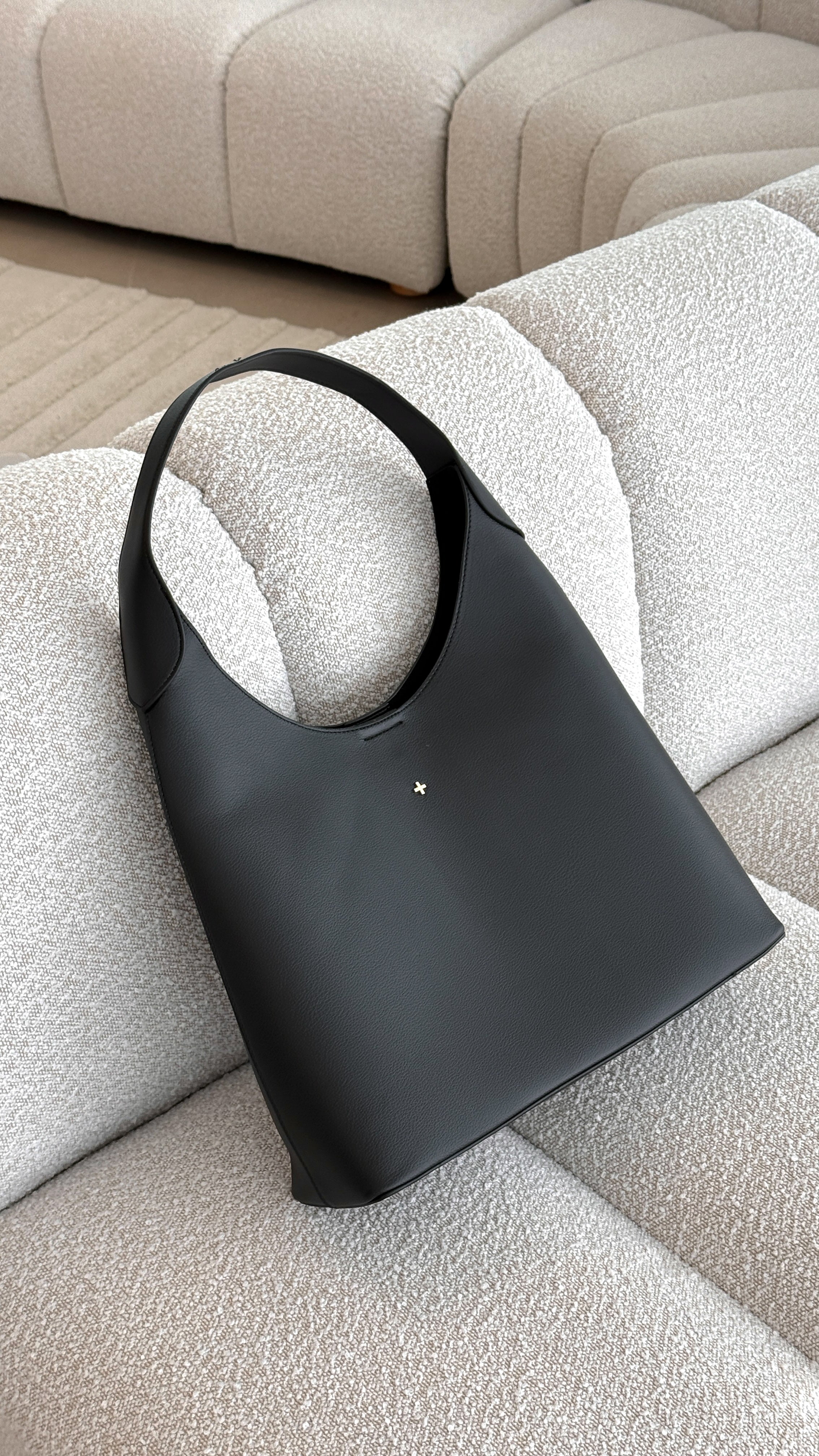 - The Duke bag is a hobo tote with a spacious main compartment secured by a magnetic clasp and one loose interior pocket for added storage.
