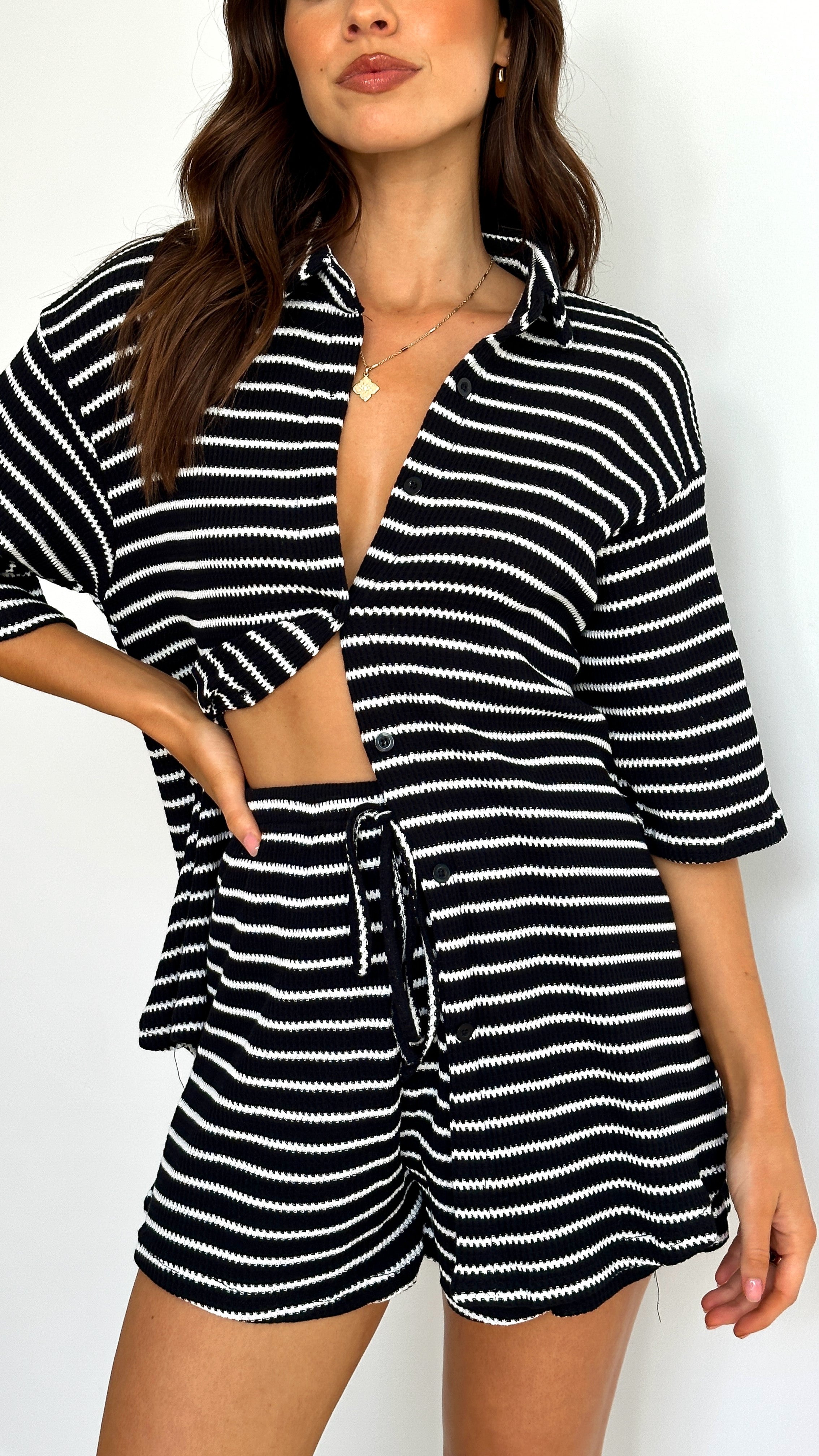 This set features a short-sleeved, collared top with a button-up front and a distinctive waffle texture, crafted from 100% cotton. The high-waisted shorts include an elasticated waistband and lining, also showcasing the same waffle texture and made entirely of cotton for comfort and style.