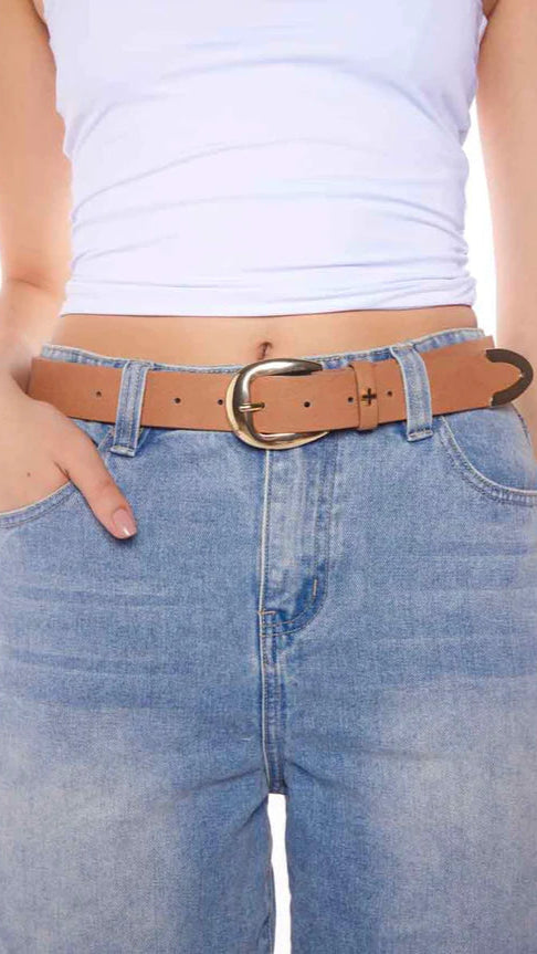 - The belt features buckle detailing, a metal V-tip, gold hardware, and the signature Peta + Jain logo.