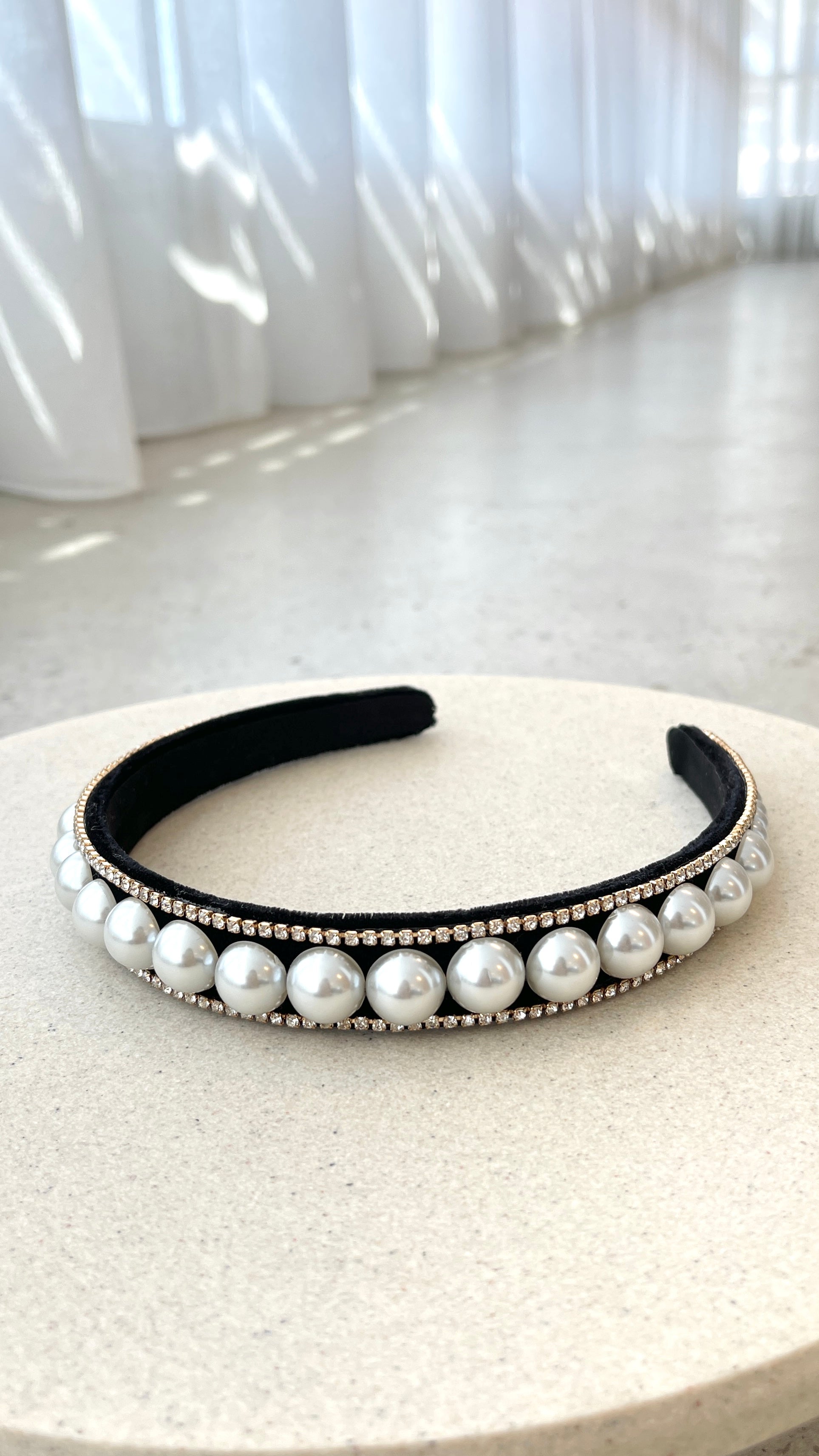 The Sana Headband in Black Pearl adds a touch of elegant drama, featuring pearl and jewel detailing set on a black velvet headband. Perfect for event styling, the fitted headband ensures an effortless feel while tying an outfit together with an elegant finish.
