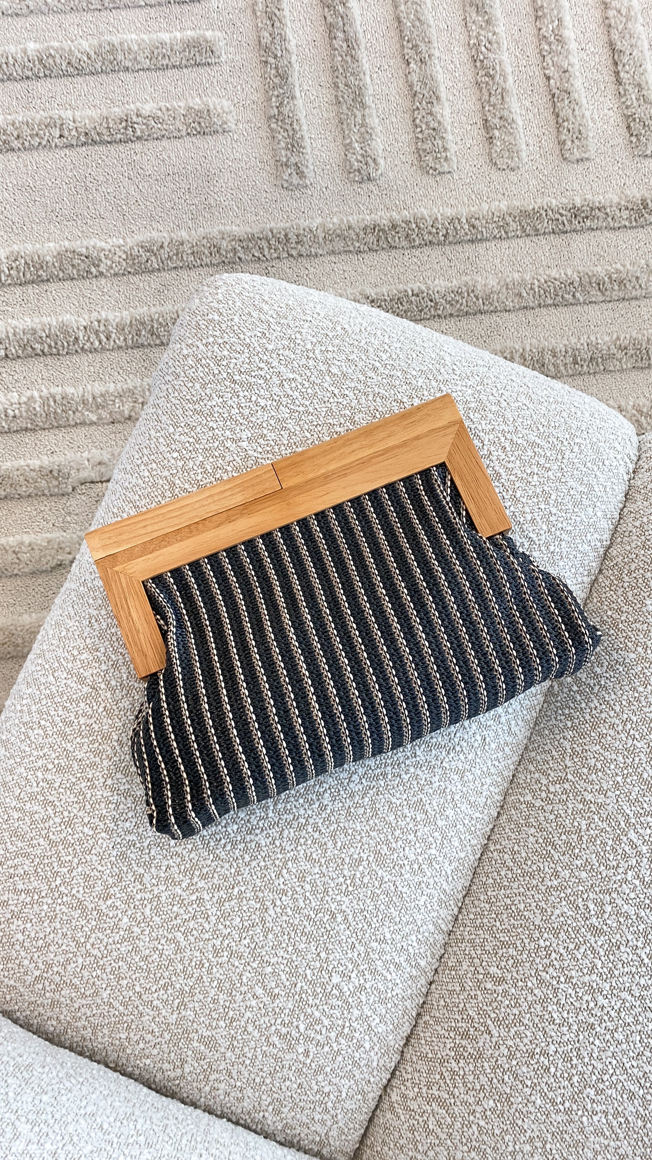 Add a luxurious finish to your ensemble with the Zoey Thin Stripe Timber Frame Clutch.